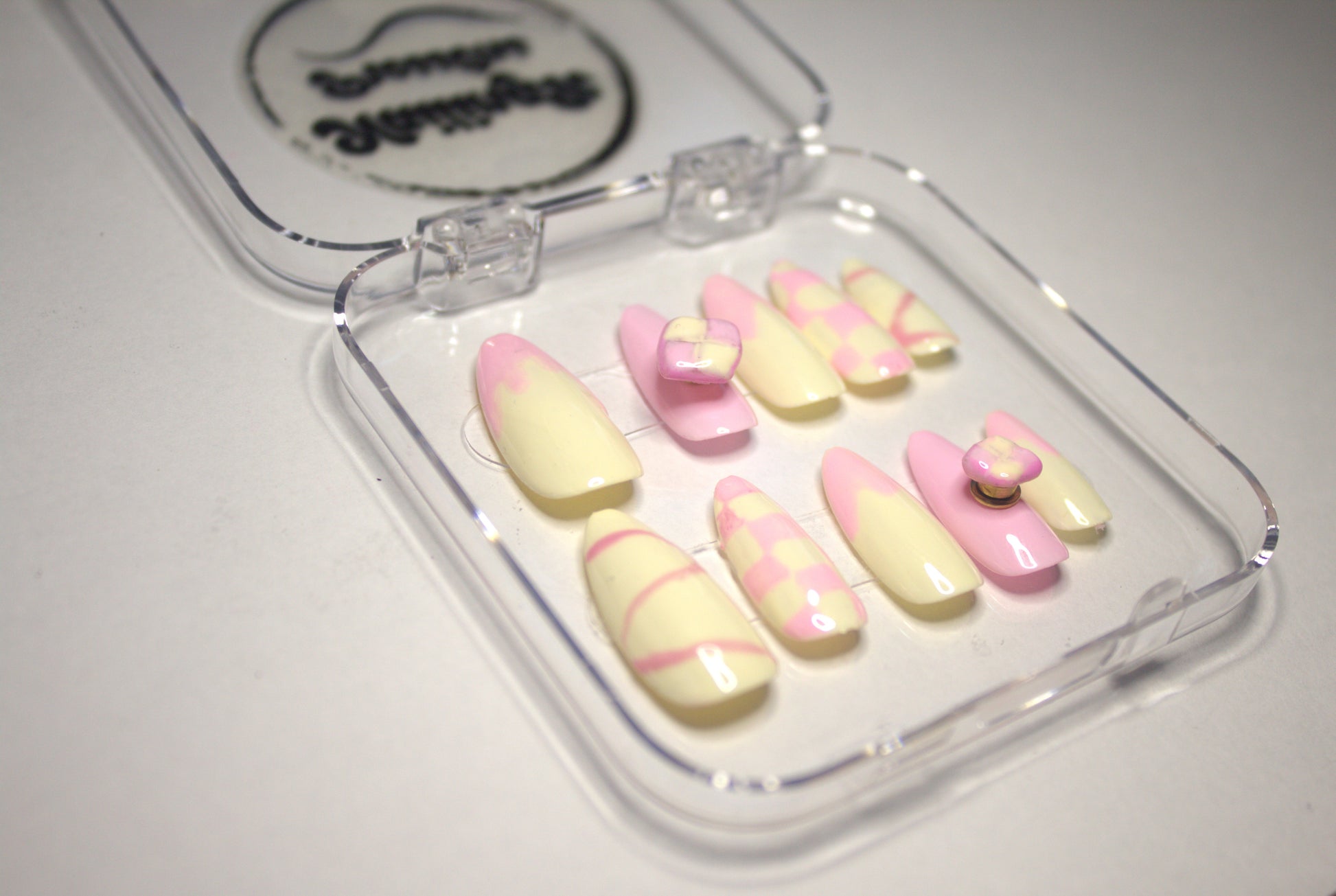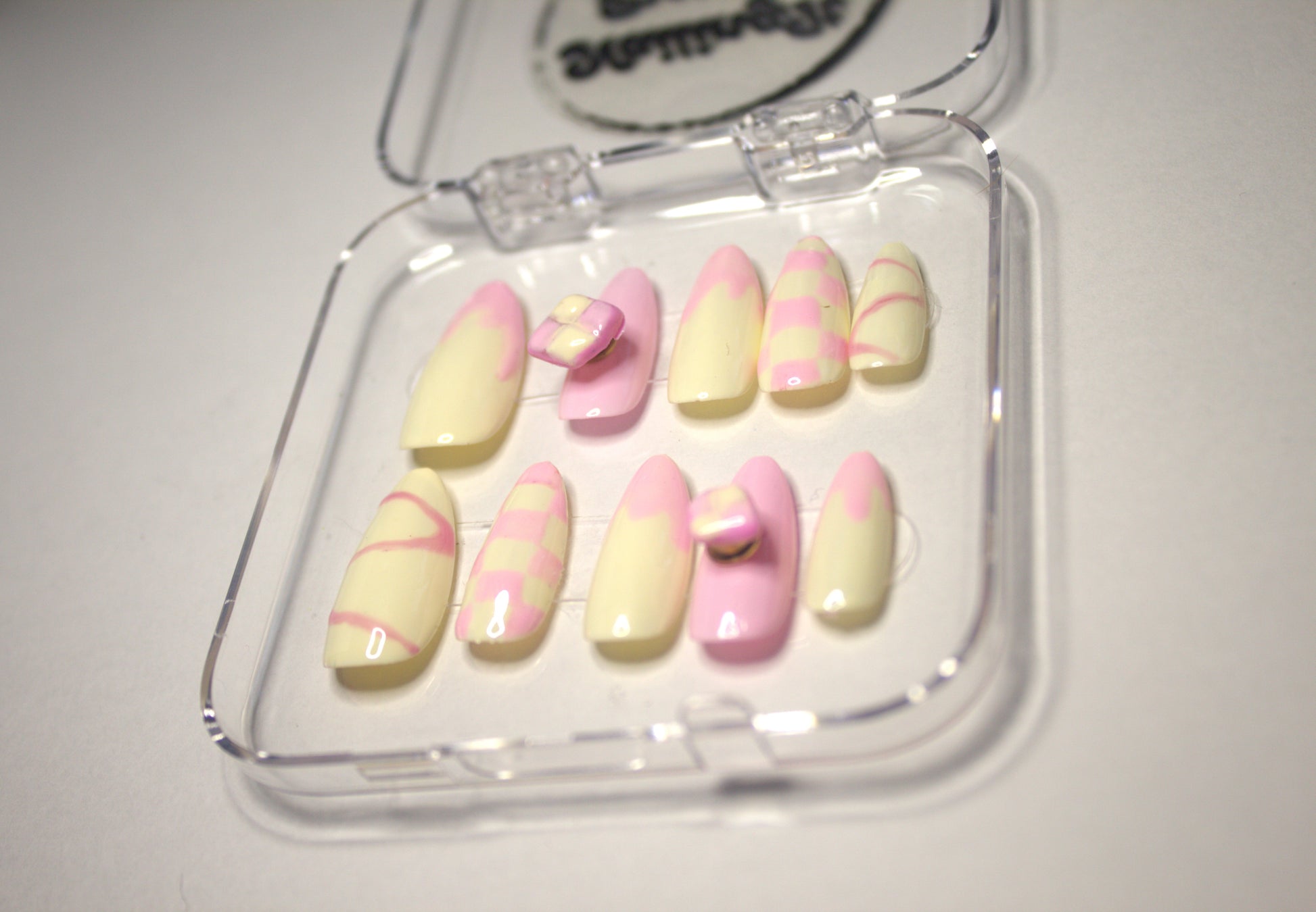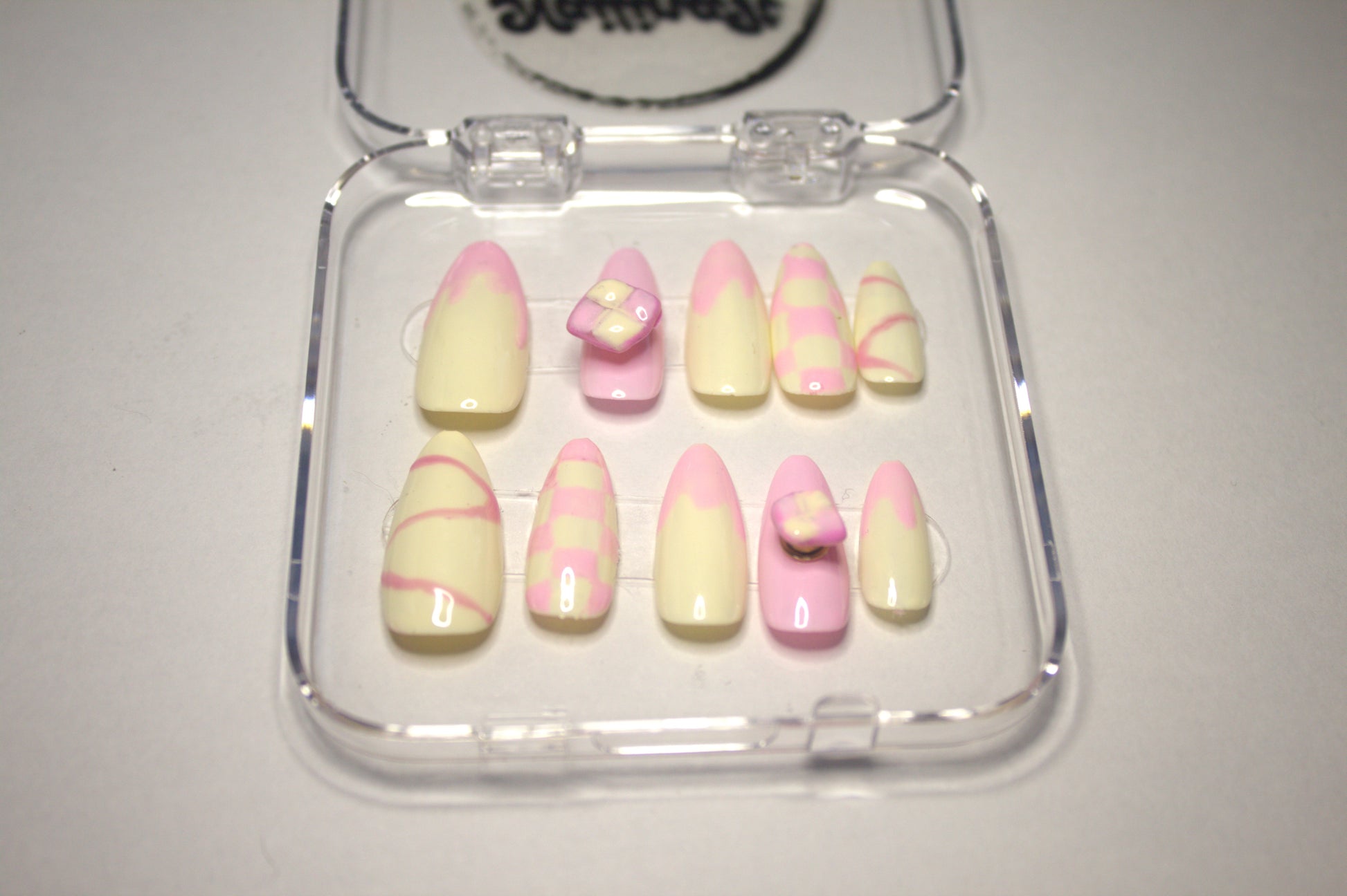 This set comes in three sizes or custom sizes. To know your size measure the longest width of your nail with either a fabric tape. Or you can use a piece of tape over your finger. Mark the two points then take it off and measure it with a ruler. Write down this number and choose from one of the sizes. Custom sizes are also available.