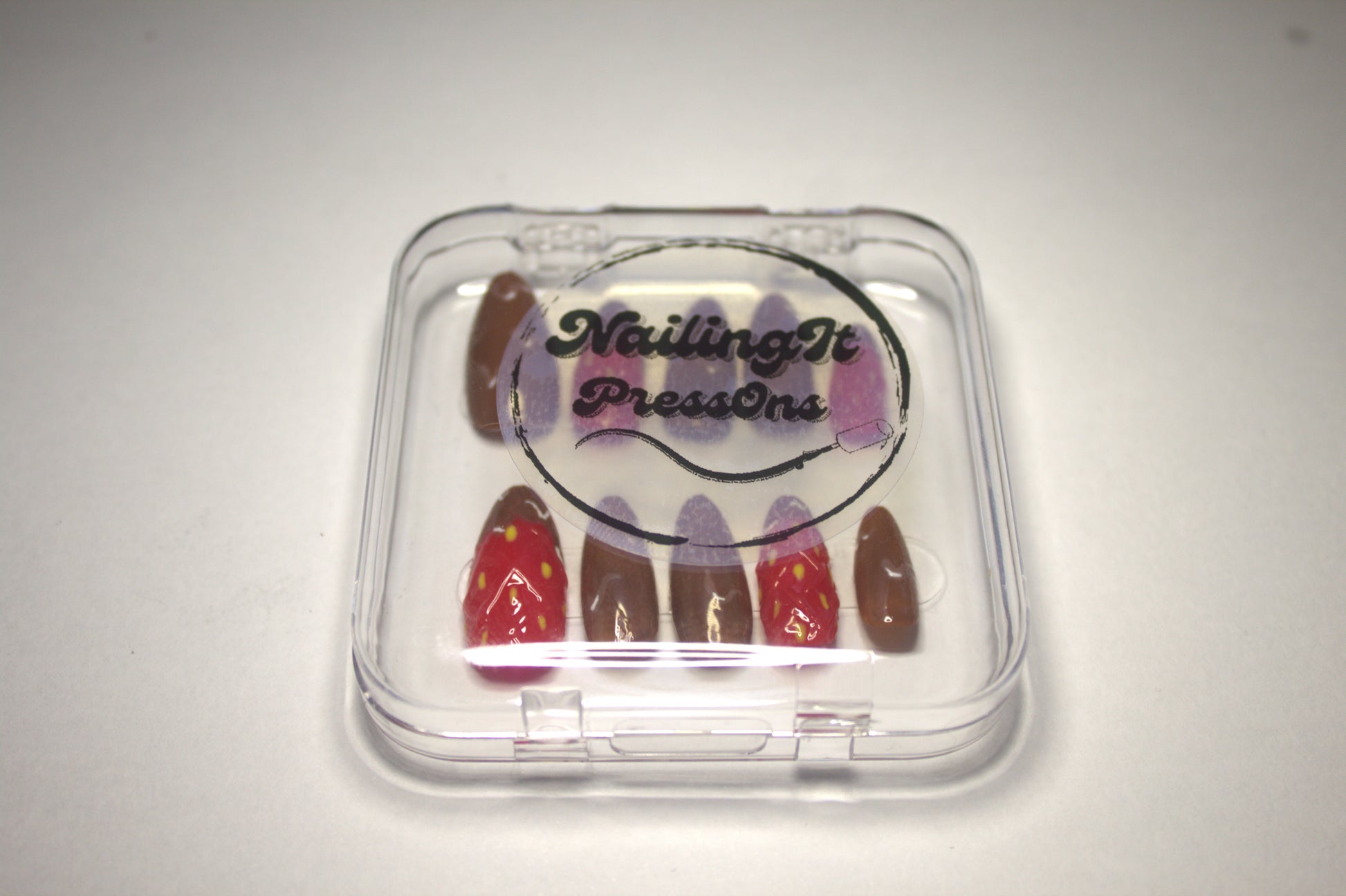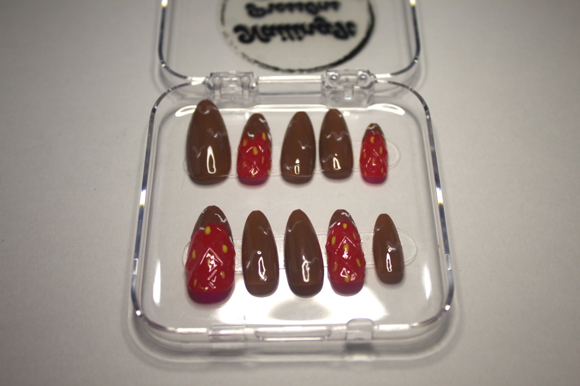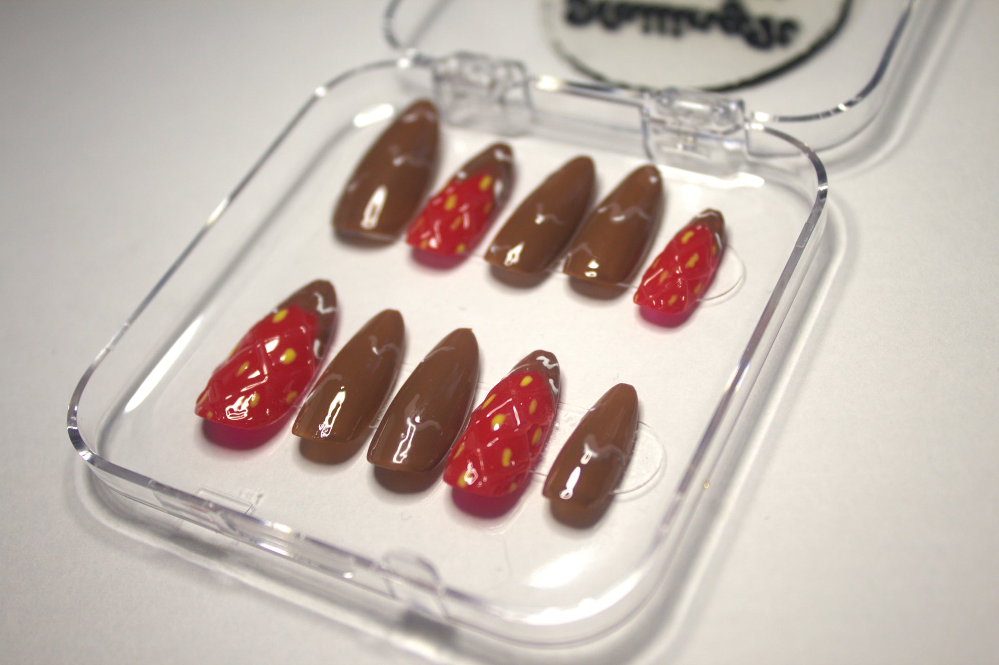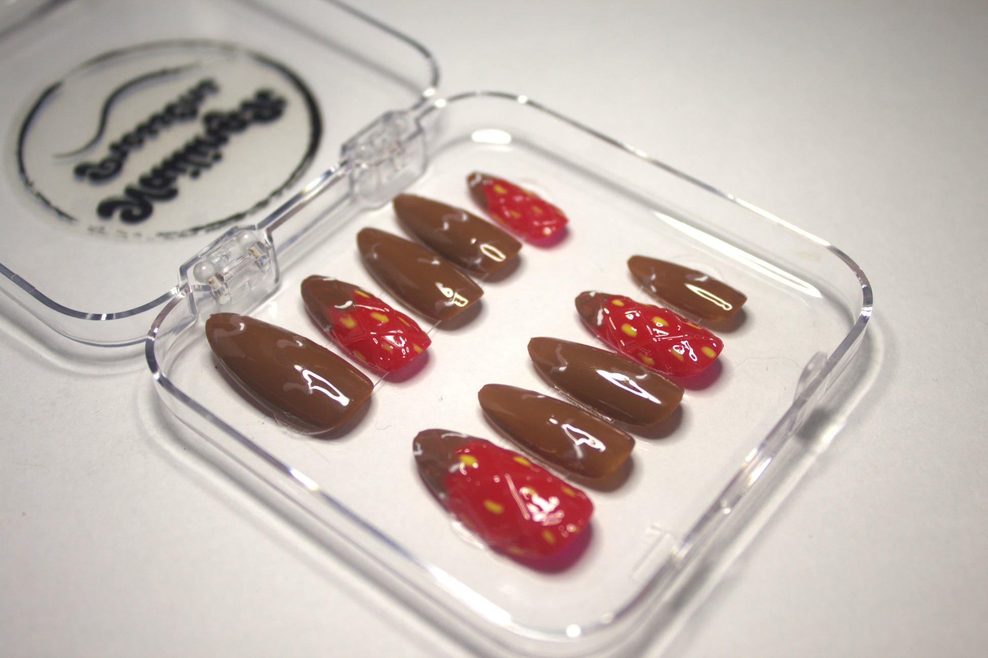 This set comes in three sizes or custom sizes. To know your size measure the longest width of your nail with either a fabric tape. Or you can use a piece of tape over your finger. Mark the two points then take it off and measure it with a ruler. Write down this number and choose from one of the sizes. Custom sizes are also available.